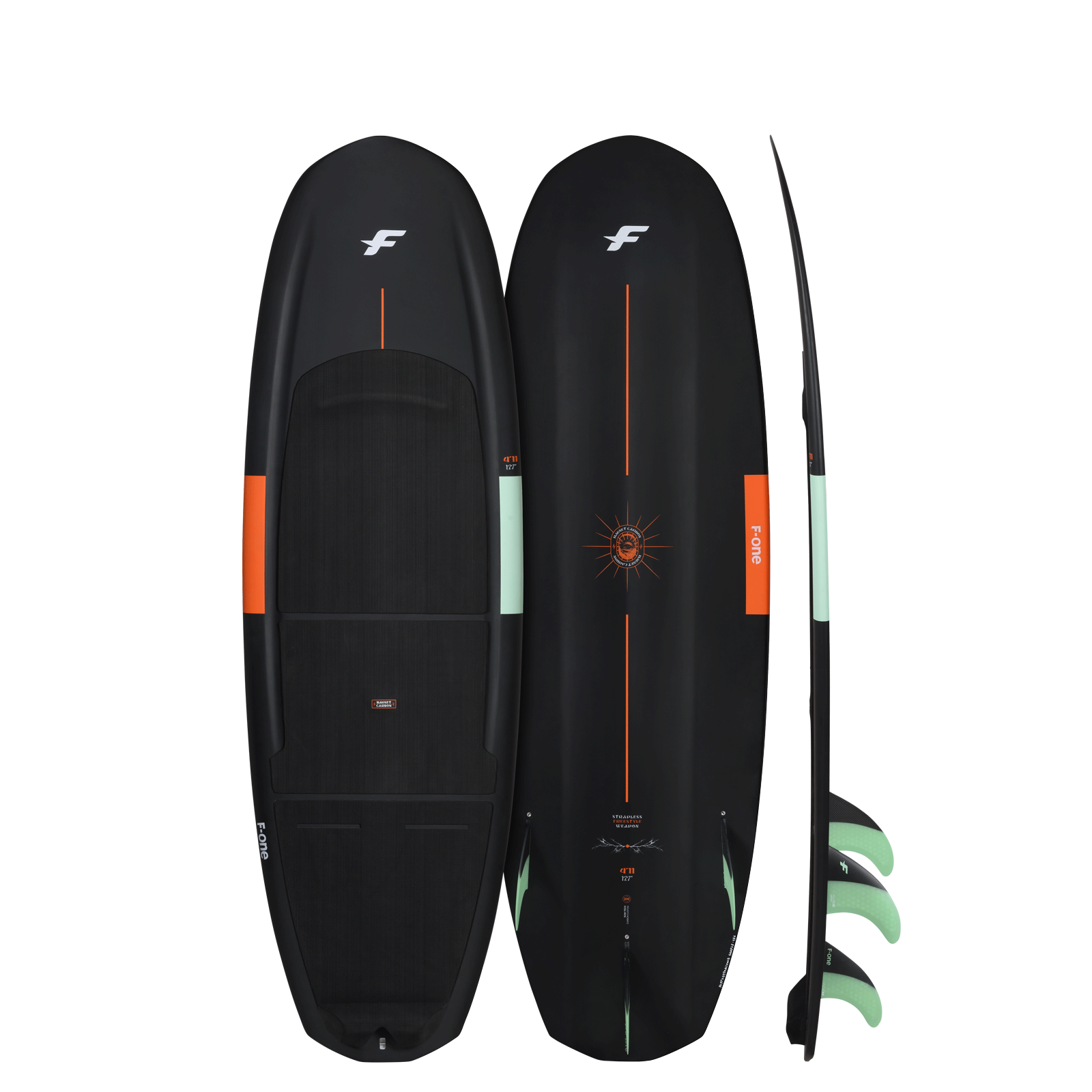 This board is available in 4’11 and 5’1. It is equipped with a set of F-ONE Flow Carbon M for the front fins, and of F-ONE Flow Carbon XS for the rear fin.