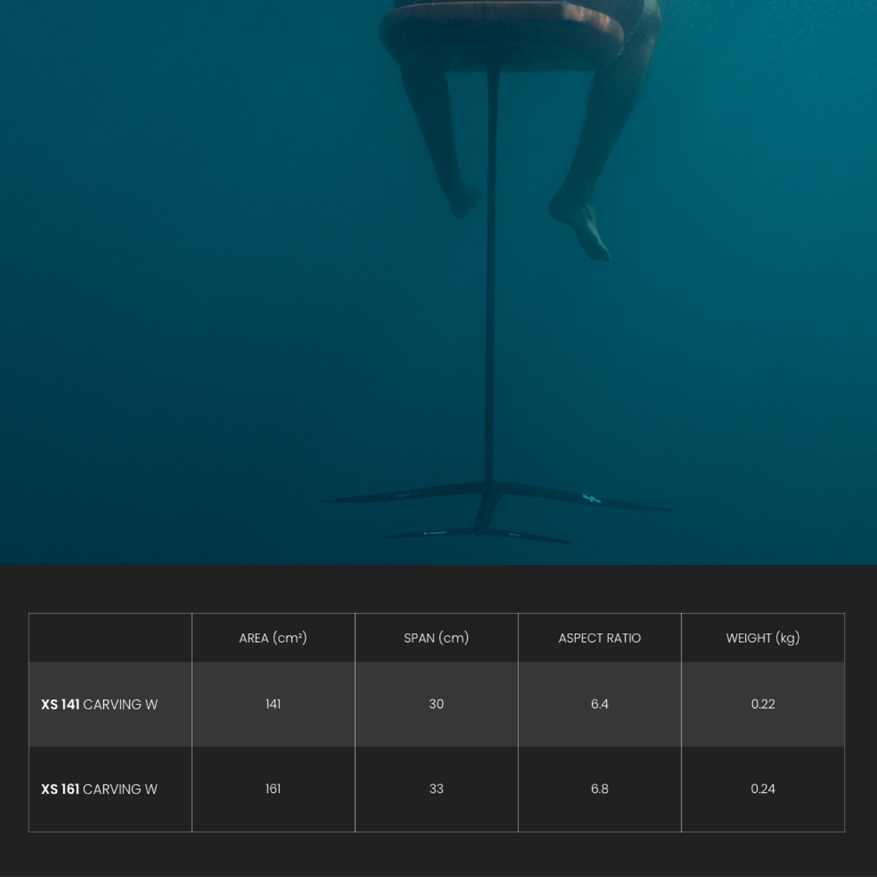 The main difference with the rest of the Carving range lies in their new profile. The Carving W profile was built to provide the best possible pitch stability and steady lift. No matter the speed, no matter how much you push in the carves, the Carving W tails will hold and stay stable. They are more difficult to pump and hence are more directed toward winging and tow-in.