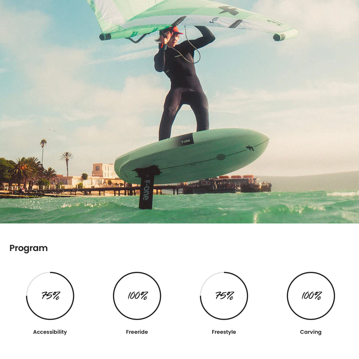 Volume is perfectly distributed to provide great stability, balance, and control during take-offs or in flight. The domed nose adds volume at the front for easy and fast take-offs, while the ergonomic recessed deck brings you closer to the foil to always feel locked into the board and connected to the foil. The rocker is straighter in the back foot and foil area, leading to a better balance at all stages of the ride.
