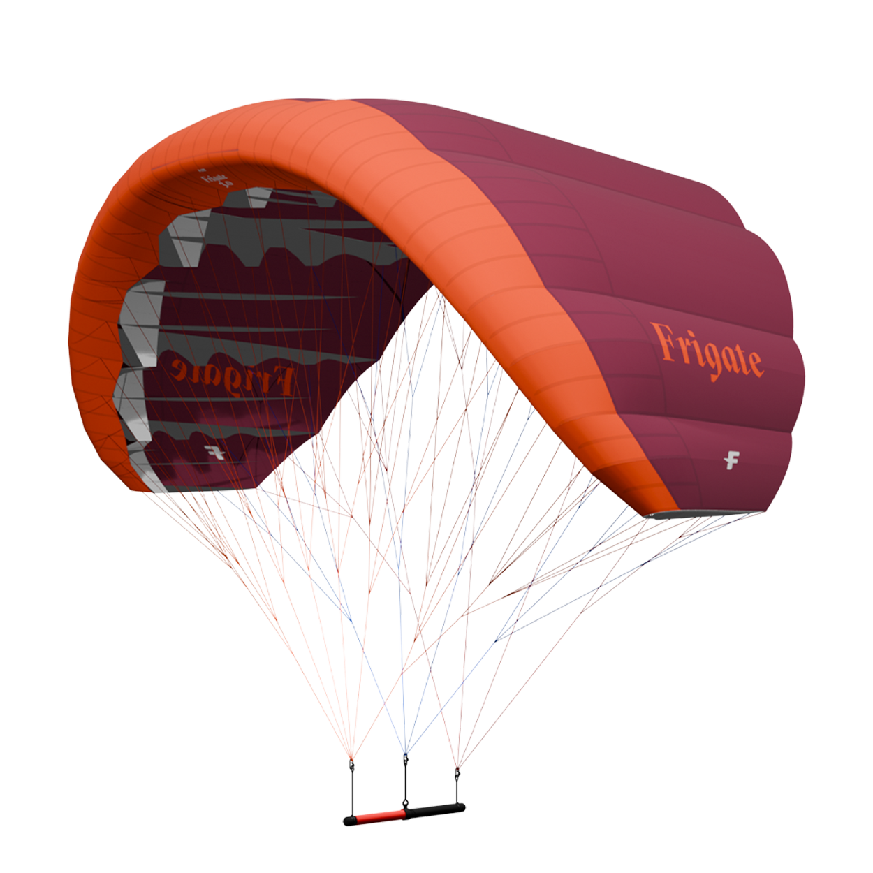 The FRIGATE’s design includes mini-ribs and D-ribs. Derived from paragliding, these allow for a better definition of the profile and a reduction in the number of bridles.