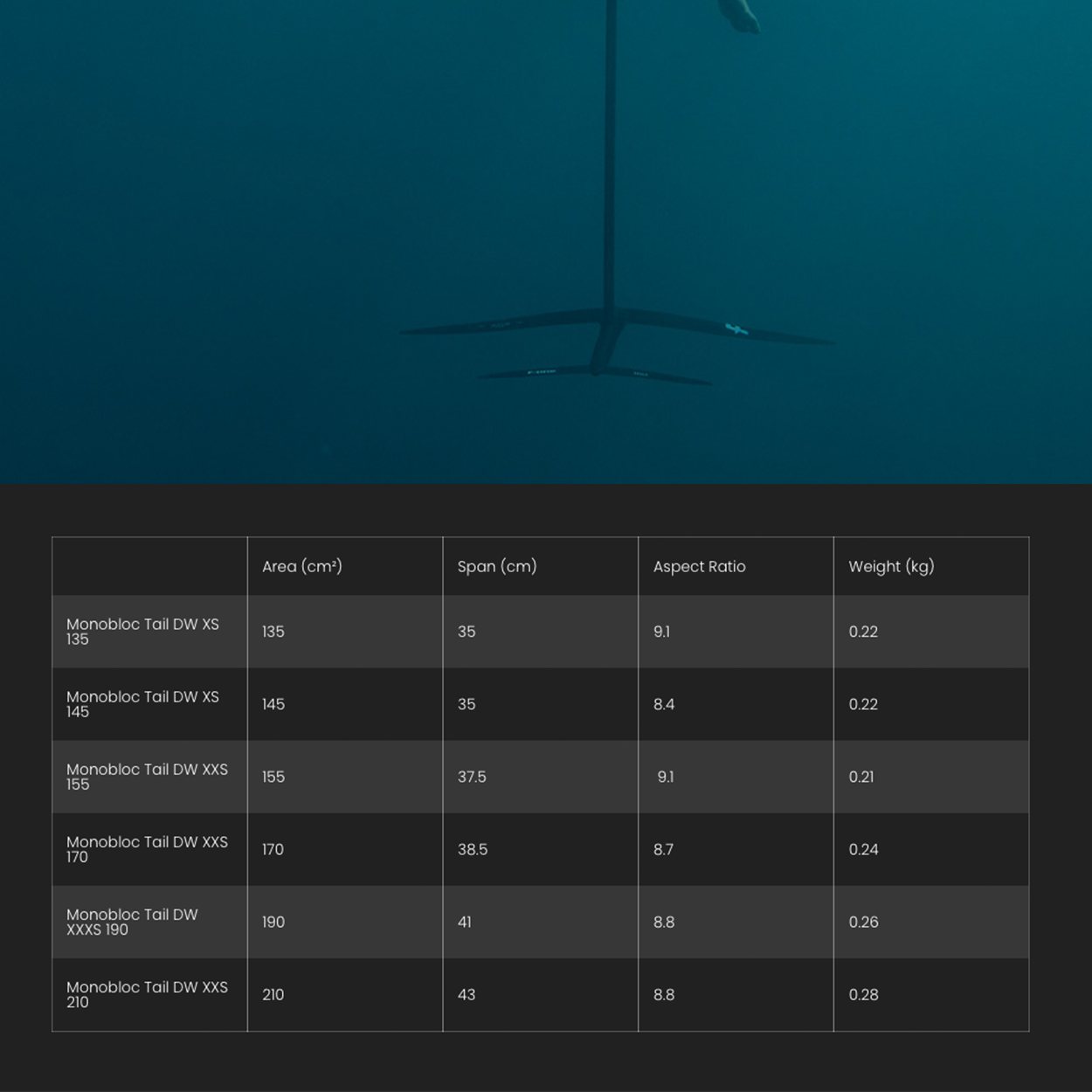 With a high aspect ratio (10.0), these new Monobloc Tails DW are optimized to provide a greater glide, a smoother take-off and improved low-end performance, while ensuring a stable, comfortable ride and excellent stability at speed.