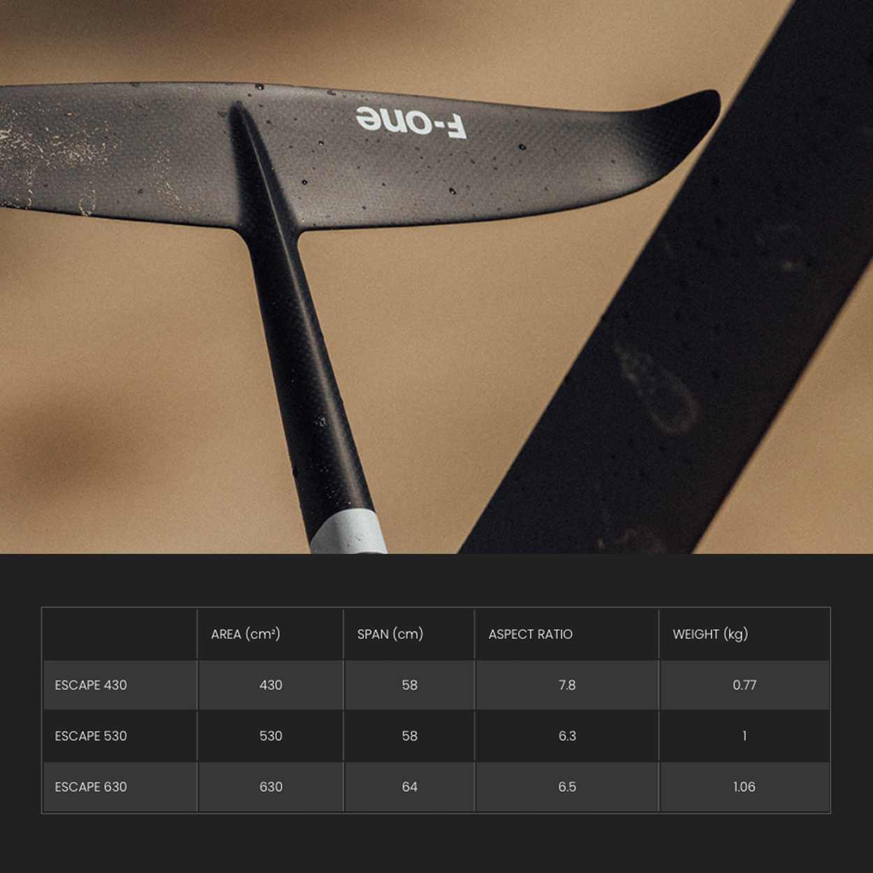 The ESCAPE HM CARBON is available in three sizes: 630 cm², 530 cm² and 430 cm², our newest size. With an aspect ratio of 7.8, the 430 will let the experts experience thrilling speeds and tackle massive waves. It is also a great fit for riders of a smaller stature or to wing foil in strong winds.