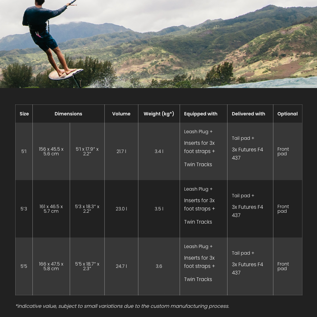 This board is available in three sizes: 5’1, 5’3 and 5’5. All are equipped with a tail pad, a fin set of Futures F4 437 Thruster, foot straps inserts, as well as deck inserts in the ideal location for a V-strap setup at the front to get the most out of your foiling. Adding a middle and front pad is also an option if desired.