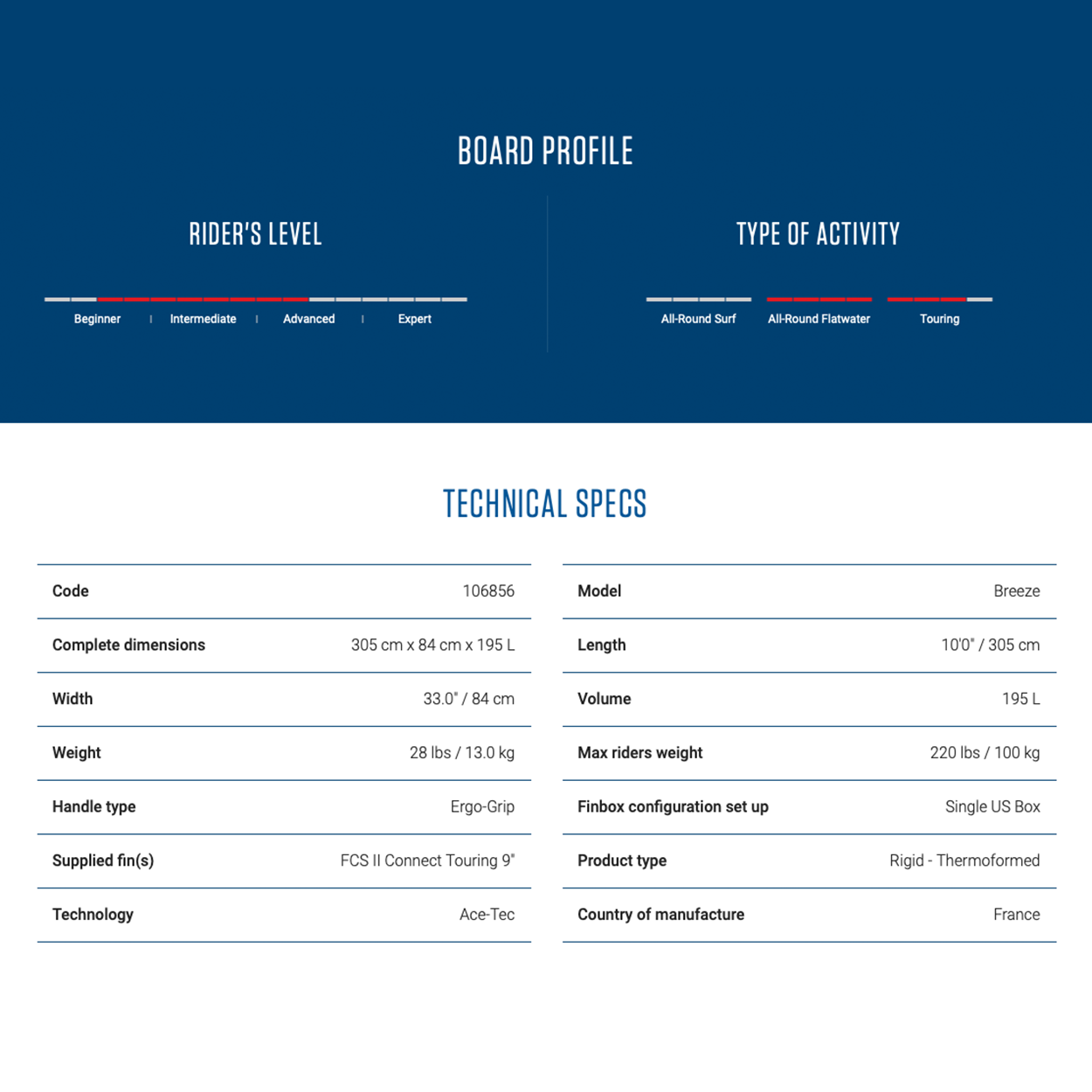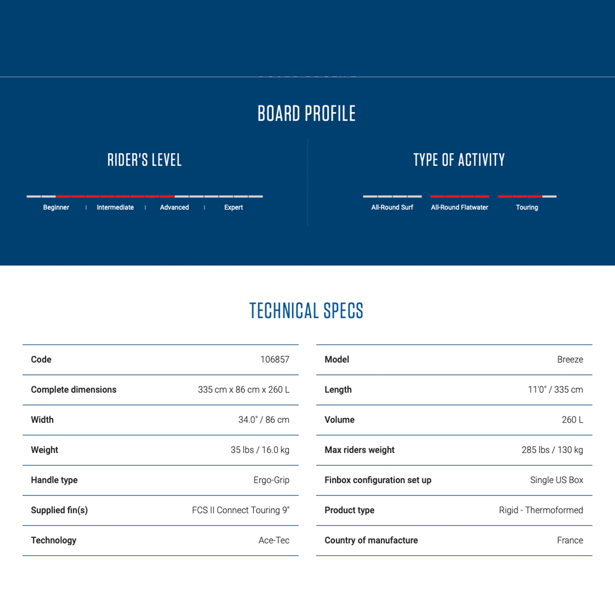 An ultra-stable platform equally suited for first-timers, family fun, fitness, yoga, fishing or whatever your next SUP adventure may be. The unique ‘hybrid’ design of the Cross features a keeled nose for excellent tracking, full rail-to-rail volume for enhanced stability and maximum use of the entire deck, and a full waterline to increase speed and efficiency. The Ace-Tec construction makes the Breeze a rigid paddle board with structural reinforcements, which gives it a very good glide.